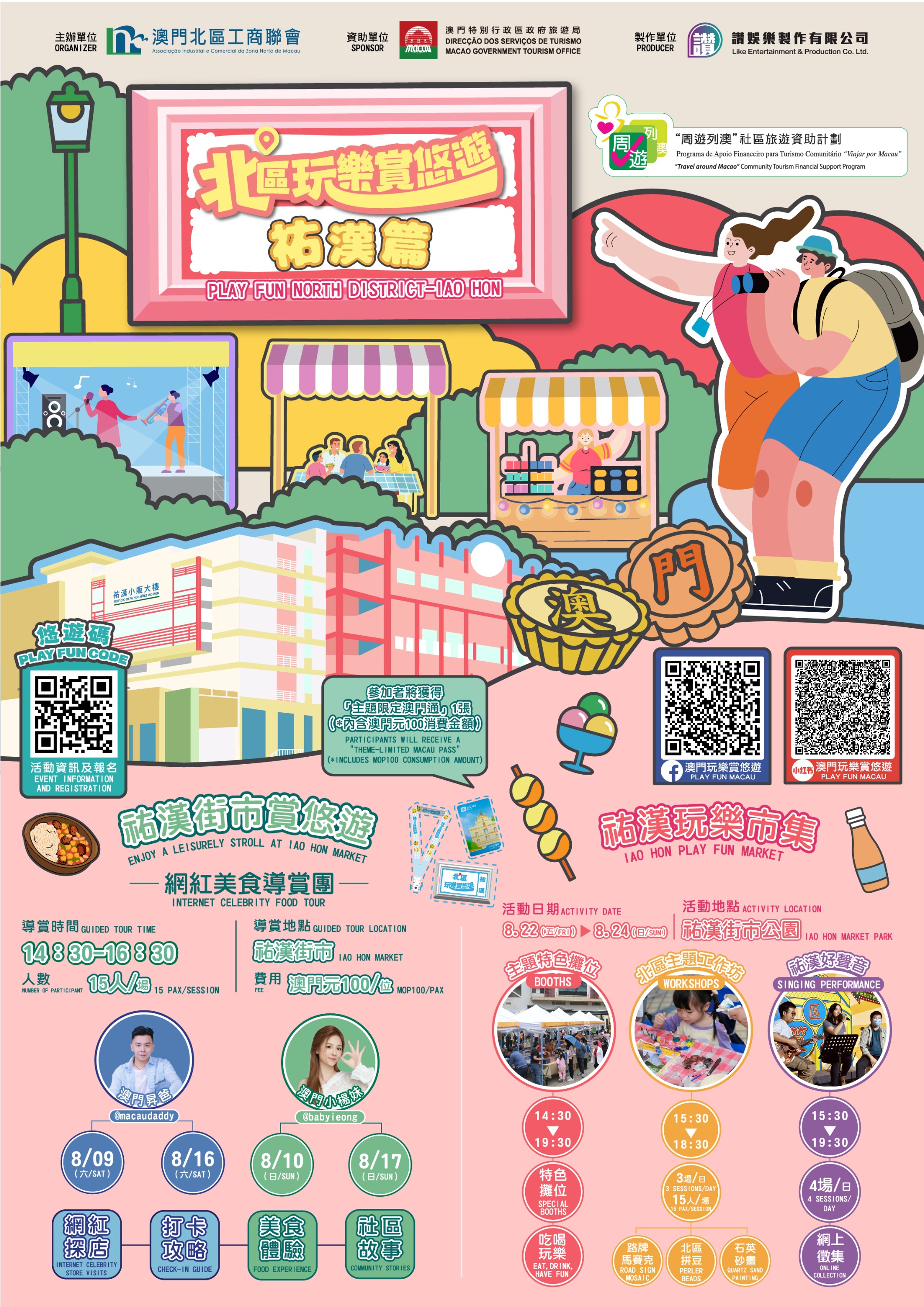 由澳門北區工商聯會主辦、澳門旅遊局資助的「北區玩樂賞悠遊─祐漢篇」市集活動,於2025年8月22日至24日14:30-19:30在澳門祐漢街市公園舉行。活動期間不僅設有豐富的市集攤位及北區主題工作坊,更將舉辦「祐漢好聲音」等精彩項目。期望透過多元活動,吸引市民和遊客深入感受本地生活氣息,引導旅遊消費進入社區,提升北區的旅遊吸引力,並將祐漢街市公園打造成為居民與旅客共享的休閒熱點。